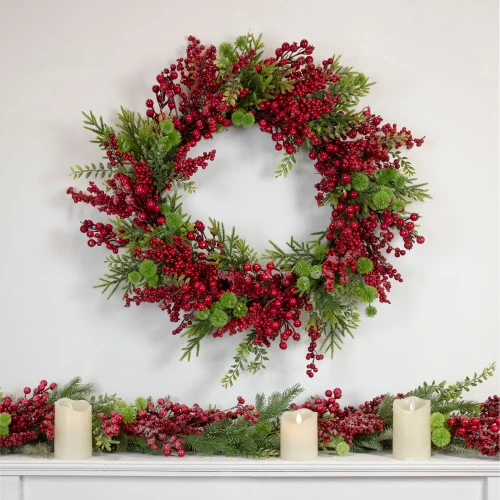 Accented with frosted ice and shiny red berries