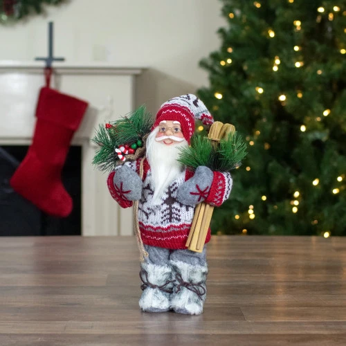 Over his shoulder burlap sack filled with berries, candy canes, artificial pine and a present