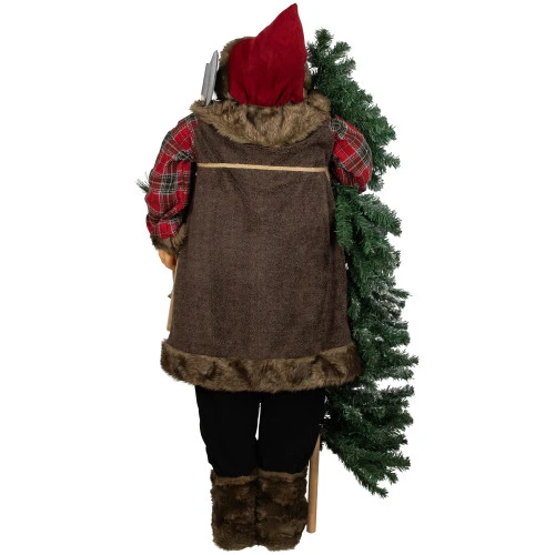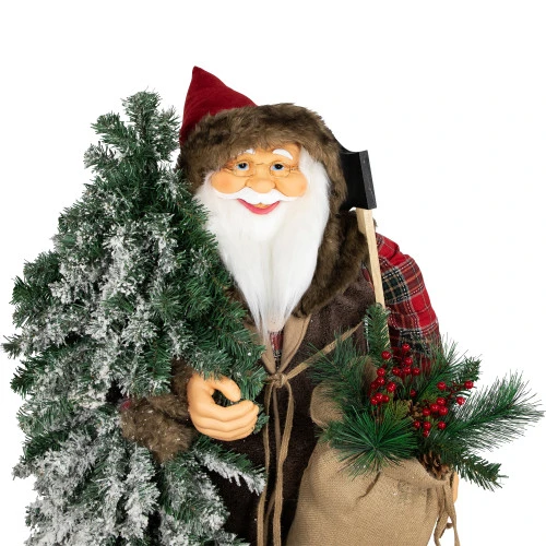 Santa holds an axe in one hand and a flocked alpine tree in the other